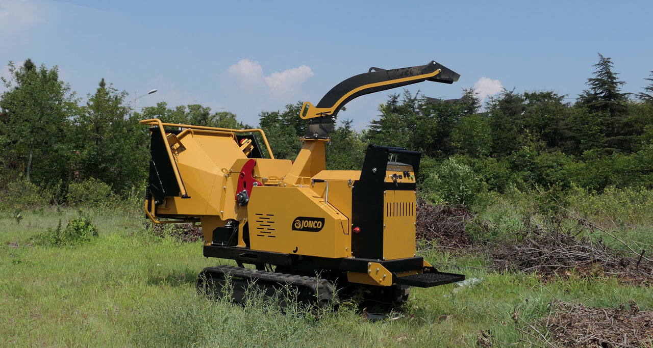 Equipped with tracks and a stand-on drive, it delivers excellent mobility, stability, and efficiency for professional tree care, landscaping, and green waste management.